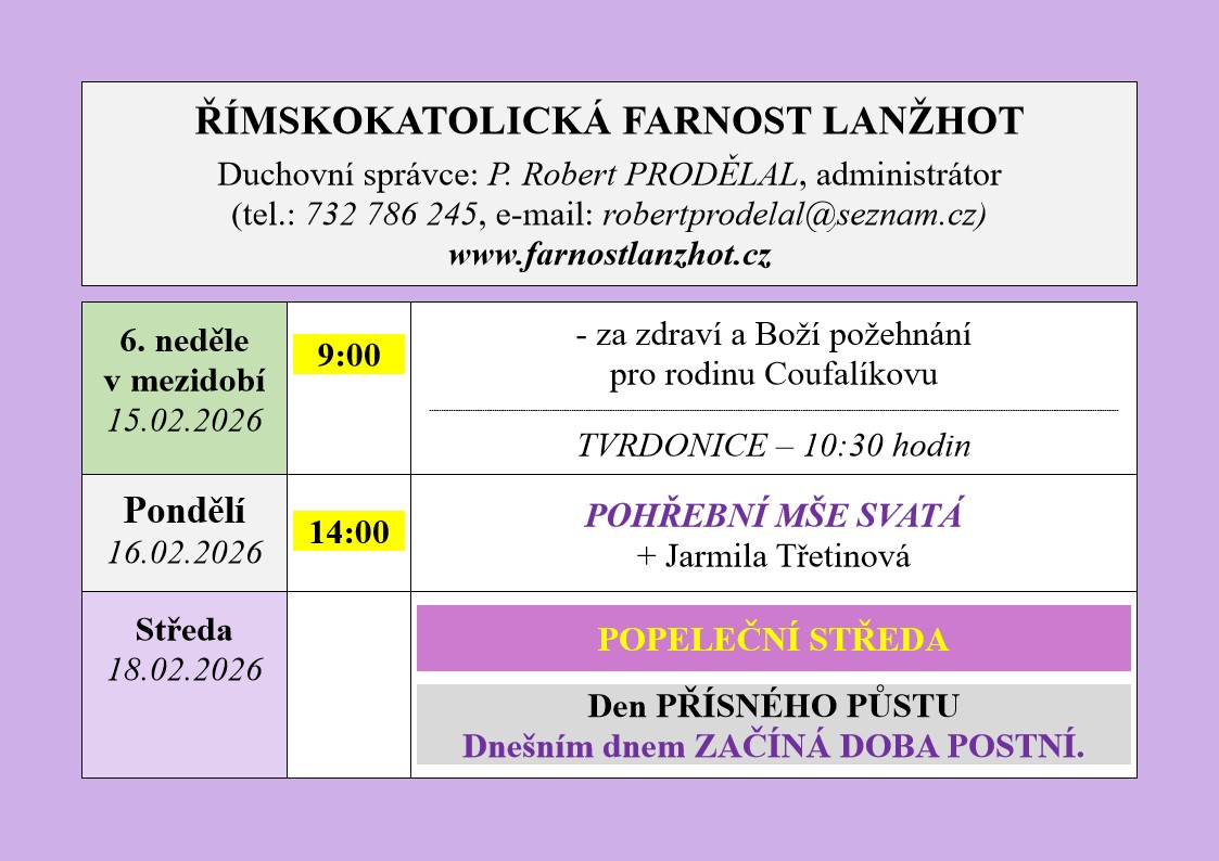 Pozn.: Obrázky a informace jsou čerpány z farních kronik, vydání Městského zpravodaje Lanžhot od r. 2006 do současnosti, z webových stránek jiných farností či ze sociálních sítí, z Wikipedie, případně článků periodik, z hrobů lanžhotského hřbitova, hlavně pak také z diecézních archivů https://archiv.biskupstvi.cz/vyhledavani-inventare/?pojem=lan%C5%BEhot&hledej=Hledej/ a https://www.mza.cz/actapublica/matrika/hledani včetně knih "LANŽHOT - příroda a dějiny (TEPS PRAHA 1983)", "Vlastivěda moravská – břeclavský okres (Musejní spolek 1911) a soukromé publikace R. D. Aloise Mikysky "Galerie kněží brněnské diecéze – děkanátu Břeclav," jež byla v 70. letech 20. století sestavena pro vnitřní potřeby farnosti Lanžhot. Užito bylo i Katalogů brněnské diecéze – neproměnné části (2007) a proměnné části (2019), a stejně tak několika publikací z díla Topographie von Mähren od G. T. Wolného (19. stol.).