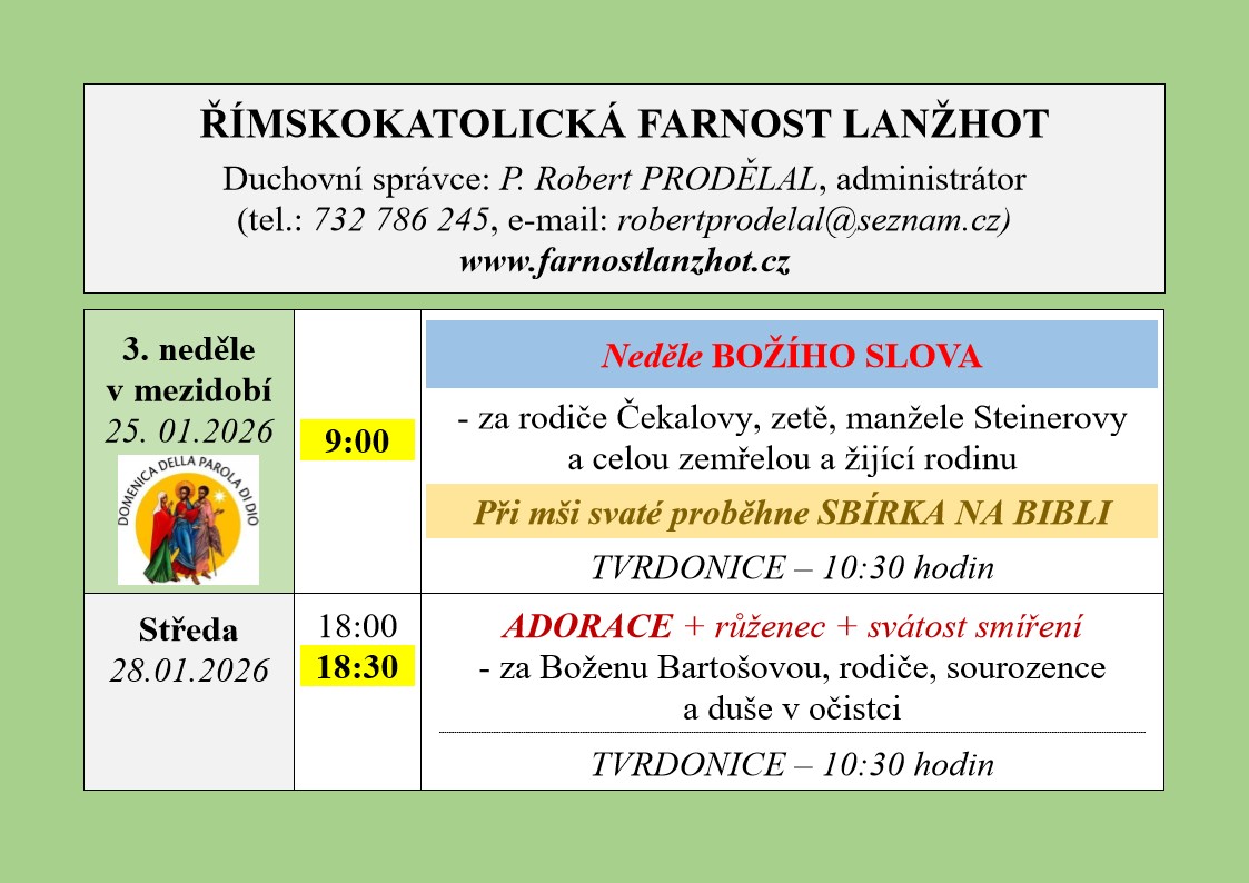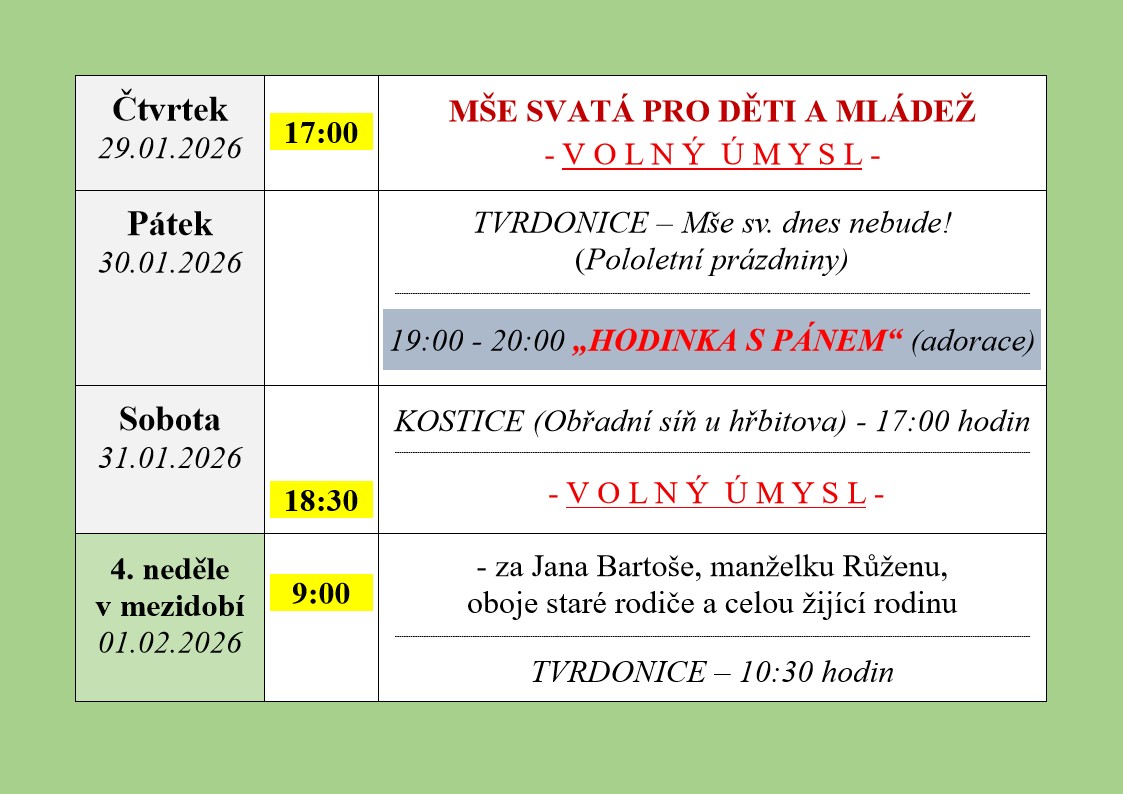 Rozvrh je prozatímní, rodiče dětí, kterým termíny navyhovují, prosíme, aby se domluvili s duchovním otcem.