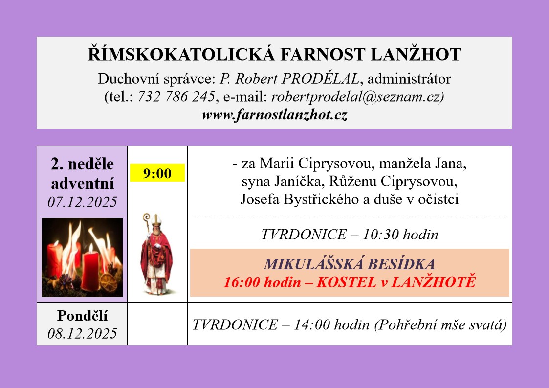 Paní Kořínková – v neděli 2.12. v 16 hodin přijde do kostela sv. Mikuláš. Budou nachystány balíčky pro děti. Pokladničky v kostele zůstanou ještě v neděli 2.12.