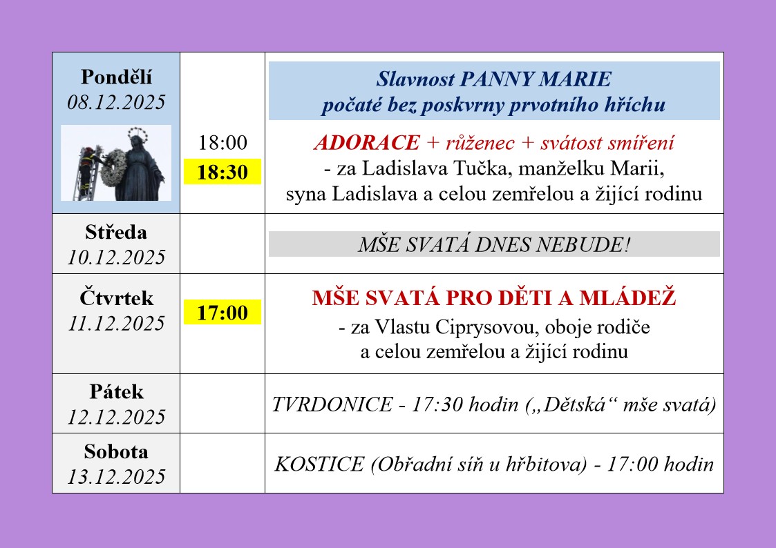 V neděli 9.12. bude dětská mše sv., 28.12. mše pro děti a rodiče. V pátek 21.12. se bude udělovat svátost nemocných těm, kteří nepřijali v únoru t.r.