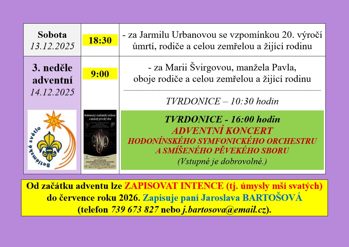 P. farář zjistil, že do Břeclavi přiveze 22.12. zvláštní vlak betlémské světlo. Paní Bartošová zajistí u pana Moravce, aby skauti pro světlo do Břeclavi zajeli a pak je přinesli v neděli 23.12. na začátku mše svaté do kostela.