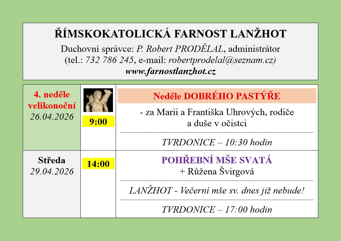 | 29.3. | čtvrtek | 16.30 - 18.30 | velikonoční svátost smíření | kostel | přijedou cizí zpovědníci |