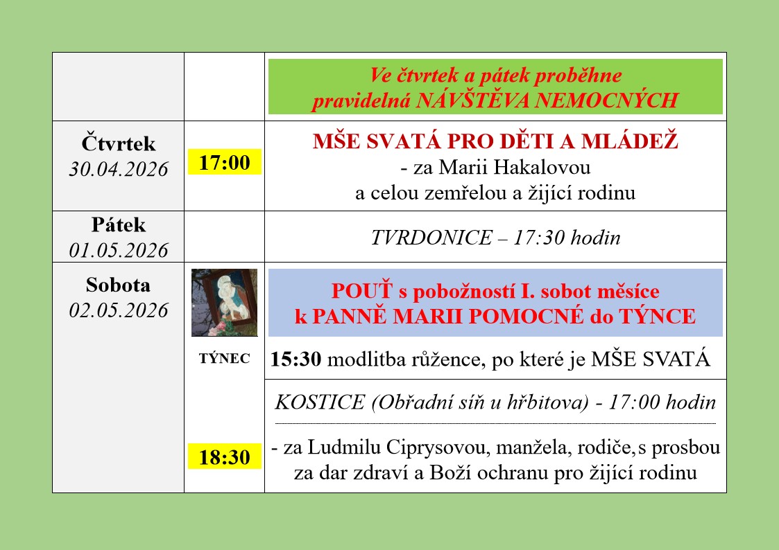 | 10.6. | neděle | 9.00 | Boží Tělo - průvod | bude jen jedna mše | |